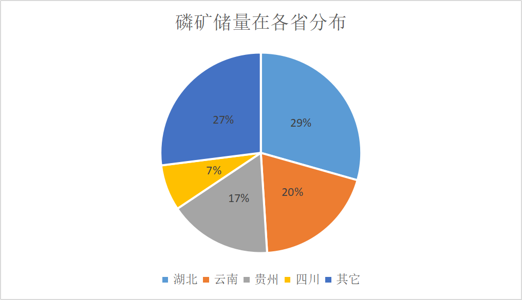 ? ? ? ? 我國是全球磷礦儲量第二的國家,磷礦資源主要分布在湖北、云南、貴州、四川等省份。從占比上看,湖北省磷礦約為63.4億噸,占比為29.4%;云南儲量約為40.2億噸,占比約為18.6%;貴州儲量約35.8億噸,占比約16.6%,四川省儲量占比較小,約為7.4%。